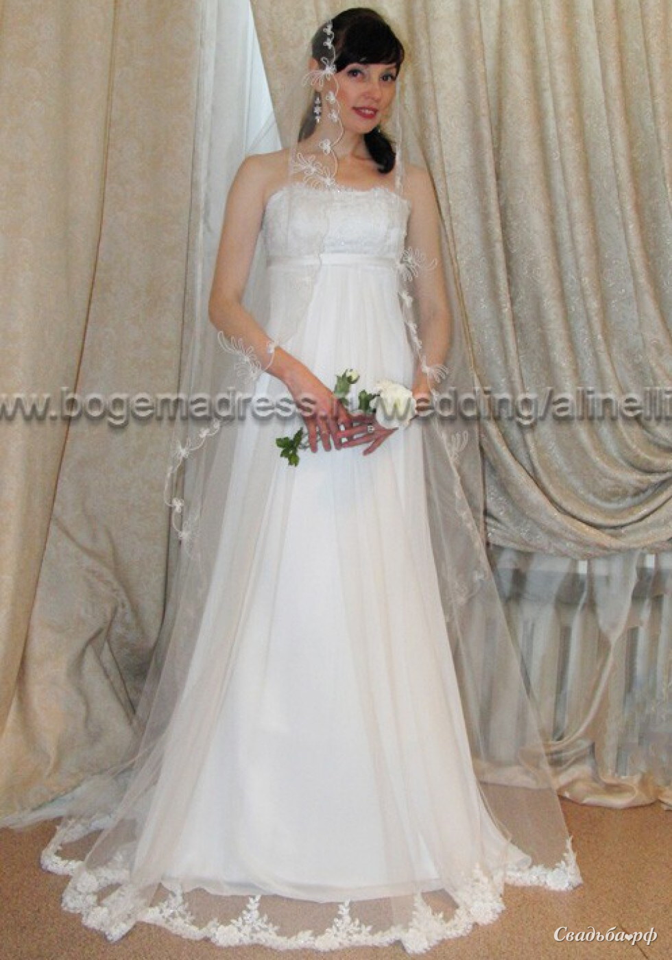 Узкое атласное платье, сверху перекрыто фатином и кружевным лифом.