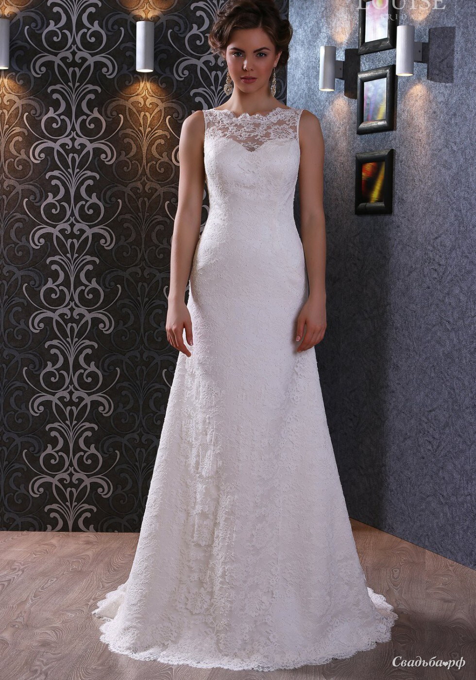 Кружевное платье прямого покроя с закрытой спиной и небольшим шлейфом.