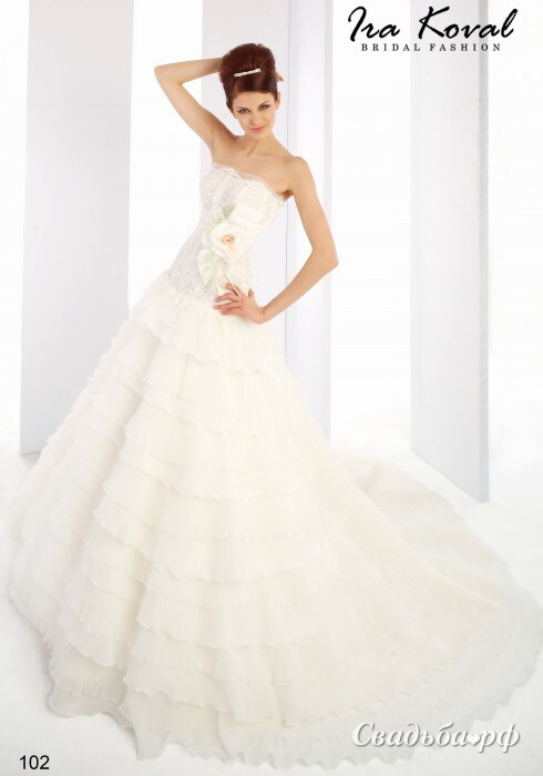 Восхитительное свадебное платье с открытой зоной декольте просто создано для самых очаровательных и дерзких невест. Заниженный корсет зрительно увеличивает грудь и выгодно подчёркивает талию. Длинная юбка из множества ярусов затейливого кружева придаёт образу невероятную лёгкость. В таком платье вы будете неотразимой.