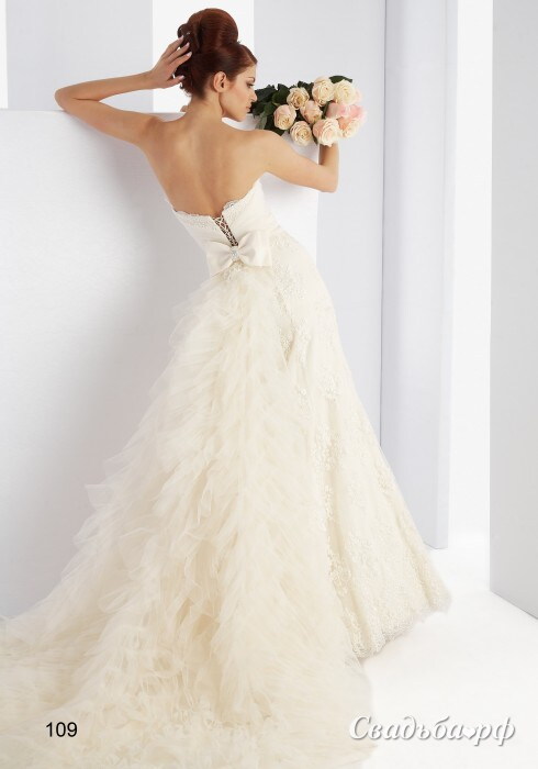 Шикарное свадебное платье для настоящей принцессы. Это платье с открытой спиной и кокетливым бантом на пояснице. Модель эффектно подчёркивает все достоинства фигуры. Пышная юбка украшена тонким кружевом и лепестками из тончайшего фатина. Изюминка платья – длинный шлейф с многочисленными воланами и объёмными сборками.
