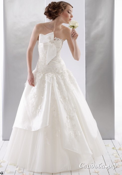 Кокетливое свадебное платье для чувственных и романтичных натур. Нестандартное расположение банта, украшающего собою лиф, сделает ваш образ неповторимым. Юбка платья выполнена из двух видов тканей. Верхний уровень юбки декорирован кружевом и стразами, а нижний уровень придает ей пышность и легкость.