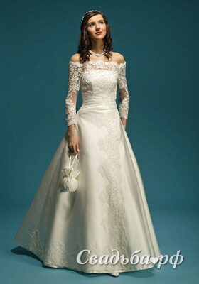 Особенность данной модели - это длинные кружевные рукава в сочетании с открытыми плечами, что создаёт неповторимый шарм. Корсаж и постепенно расширяющаяся к полу юбка декорированы изысканным кружевом. Представленное свадебное платье со скромной зоной декольте эффектно подчёркивает талию и скрывает все недостатки фигуры.