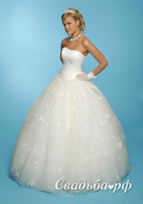 Белоснежное свадебное платье с открытой зоной декольте и слегка изогнутым верхним краем корсета. Представленная модель выгодно подчёркивает талию и зрительно увеличивает бюст. Изящный корсет украшен нежной ручной вышивкой. Пышная юбка оригинального кроя декорирована тончайшим кружевом и доходит до самого пола.