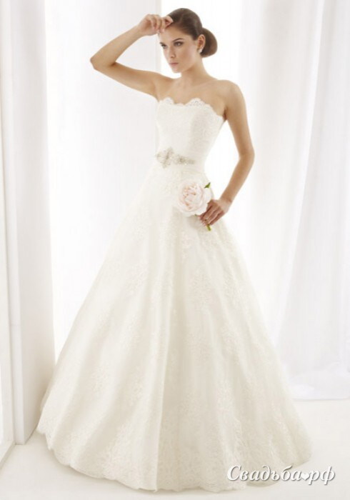 Элегантное свадебное платье А-силуэта подчеркнет изысканный вкус невесты и придаст образу чарующий невинный вид. Прямой корсет с кружевными вставками, имитирующими легкий изгиб выреза, украшен крупной абстрактной композицией, выложенной из камней и блесток. Пышную юбку, из плотной ткани, покрывает ажурная вышивка с нежным растительным орнаментом.