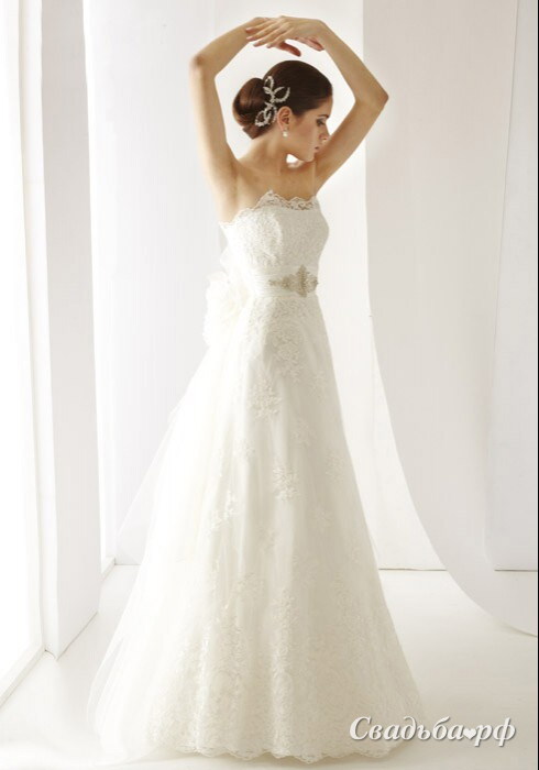 Изящное свадебное платье с легкостью поможет создать чувственный и романтичный образ невесты. Прямой кружевной корсет без бретелей по верхнему краю декорирован неширокой полупрозрачной гипюрной лентой, подчеркивая изящные плечи невесты. Платье украшено широким поясом с массивной аппликацией золотого цвета, который сзади образует большой бант. Корсет и юбка декорированы ручной вышивкой с использованием бисера и страз.