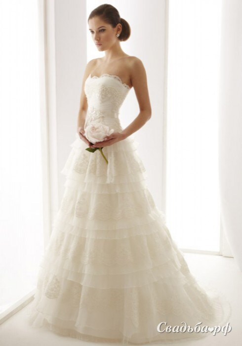 Изысканное свадебное платье подчеркнет утонченный вкус невесты и придаст её образу невинность и романтичность. Открытый корсет с легким изгибом без бретелей украшают кружевная драпировка и неширокий пояс с цветочной композицией в центре. Многоярусная ажурная юбка с множеством полупрозрачных летящих оборок плавно переходит в небольшой шлейф.