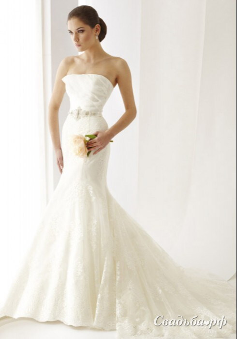 Великолепное свадебное платье для неординарной невесты, напоминающее своим кроем силуэт русалки. Прямой удлиненный корсет, соблазнительно обнажающий плечи и зону декольте невесты, украшен сложной драпировкой в области бюста и абстрактной композицией из камней и блесток на талии. До колен юбка плотно облегает бедра, от колен расширяется и переходит в длинный шлейф.