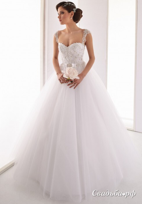 Очаровательное платье с кружевным лифом. Строгий корсет на шнуровке с открытым фигурным лифом полностью задекорирован изысканным кружевом с изумительно красивыми ажурными узорами. Кружевные бретели мягко окаймляют плечи и уходят на спину. Линия талии выделена атласным поясом с бантиком и брошью. Юбка – пышная, широкая, со шлейфом.