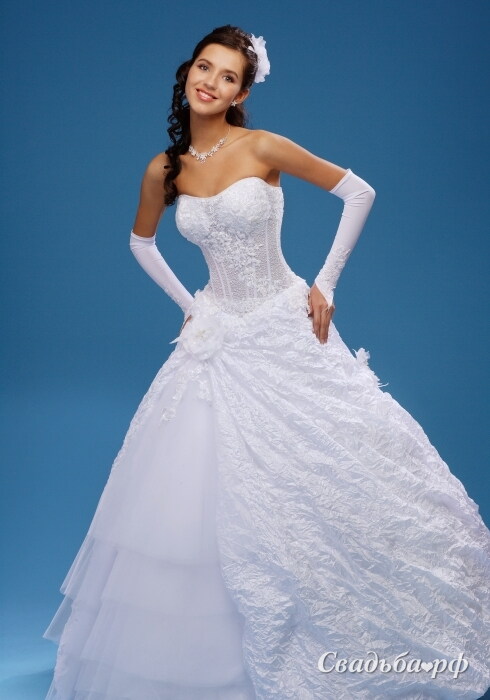 Пышная юбка и оригинальный корсет выгодно подчеркивают все достоинства фигуры невесты. Открытая зона декольте и объёмная вышивка корсажа зрительно увеличивают грудь. Модель выполнена из разных видов ткани: несколько слоёв полупрозрачного фатина отлично сочетаются с более плотной и немного жатой драпировкой.