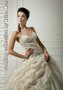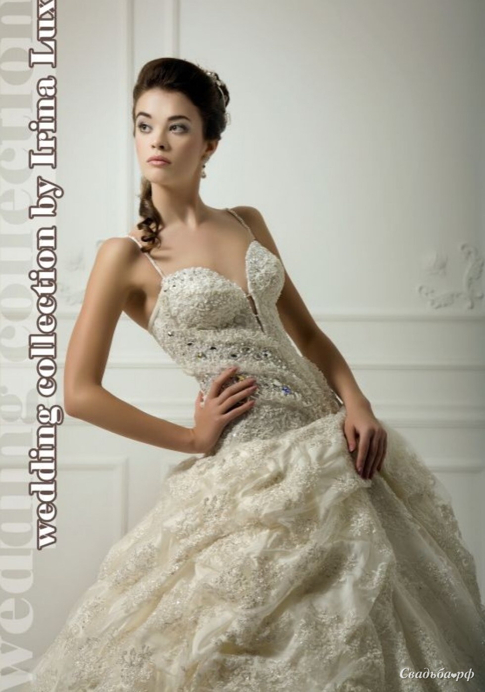 Кремовое свадебное платье с открытой зоной декольте и тончайшими бретелями. Элегантный корсет представленной модели зрительно увеличивает бюст и выгодно подчёркивает талию. Длинная юбка с крупными складками постепенно расширяется к полу. Искусная вышивка ручной работы, расположившаяся в верхней части платья, дополняет нежный образ.