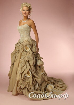 Сногсшибательное бежевое платье с открытой зоной декольте. Строгий корсет с оригинальной фактурой и скошенным верхним краем подчёркивает все достоинства фигуры. Пышная юбка с объёмными сборками и воланами постепенно переходит в длинный шлейф. Крупные цветы ручной работы придают этой модели неповторимый шарм.