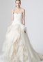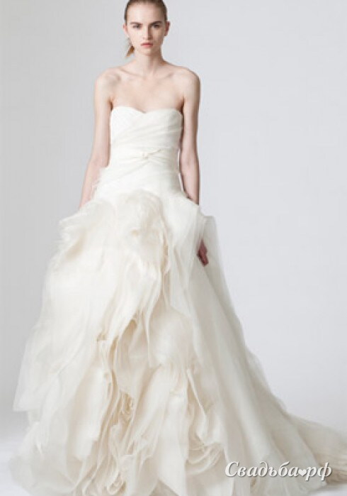 Этот свадебный наряд является шикарным воплощением женственности и чувственности. Невеста в таком платье будет чувствовать себя королевой, особенно позволит подчеркнуть изысканность стиля нежный кремовый оттенок платья. Асимметричный подол выполнен из тонкого материала, который будет на ветру эффектно развиваться и делать невесту легкой и воздушной.