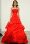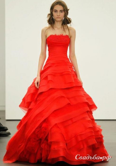 Шикарное дизайнерское ярко-красное свадебное платье от Vera Wang из коллекции Spring/Summer 2013. Верхняя часть лифа оформлена искусным кружевом. Корсет и юбка задрапированы горизонтальными лёгкими складами, переходящими в воздушные оборки. Из этих оборок и формируется невесомое яркое облако, магнитом притягивающее к себе взгляды всех окружающих.