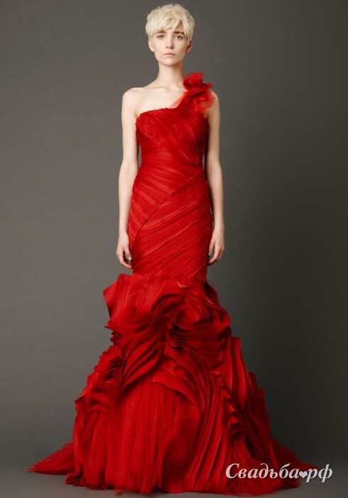 Элегантное и изысканное красное свадебное платье-русалка от Vera Wang из коллекции Spring/Summer 2013. Воздушный бант украшает одно плечо. Затейливые линии драпировки пересекаются на лифе и юбке модели. А низ юбки похож на невероятно красивый цветок розы, выращенный в сказочном саду великим волшебником.