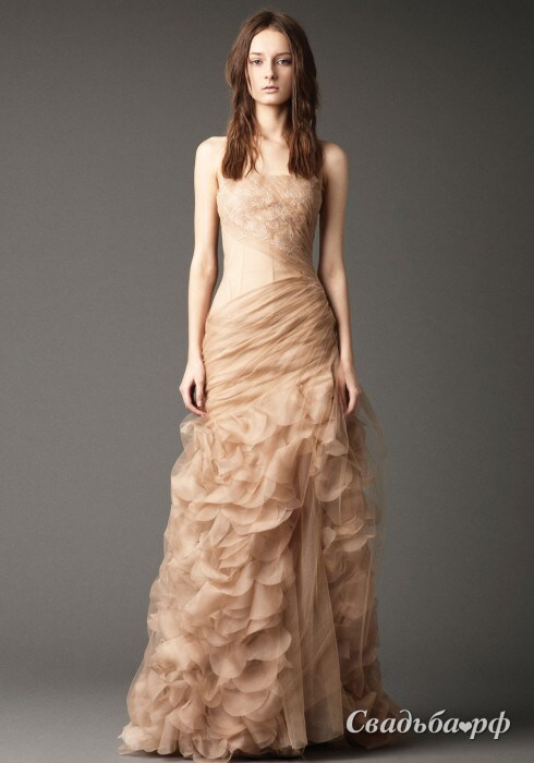 Американское дизайнерское свадебное платье от королевы мировой свадебной моды - Vera Wang. Потрясающий наряд с открытой зоной декольте, заниженным корсетом и длинной юбкой с воздушными воланами и сборками. Фирменный бутик в Москве доступен для российских невест по адресу: Москва, Кузнецкий мост, 21. Телефон: +7 (495) 626 02 20.