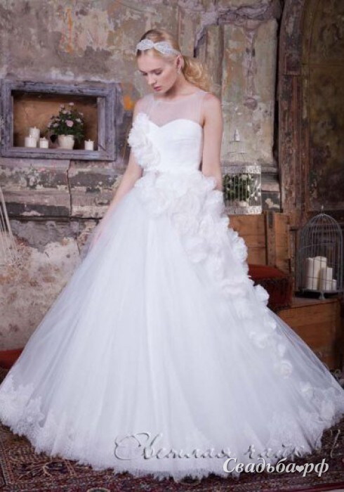 Мечтаете о невесомом образе современной феи? Тогда это свадебное платье от известного отечественного бренда Sofoly придётся Вам по душе. Полупрозрачная вставка на груди и объёмные цветы ручной работы придают наряду весеннюю свежесть в любое время года. Талия подчёркнута изящным пояском. Пышная юбка с ажурной окантовкой смотрится восхитительно.