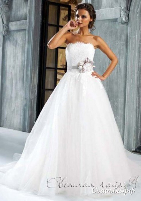 Нежное пышное свадебное платье с поясом и цветами из атласной тонкой ленты необычного цвета пепла розы. Красивое органичное сочетание полностью расшитого кружевом корсета и сдержанной фатиновой юбки, великолепно смотрится благодаря плавному переходу кружева сверху вниз.
