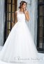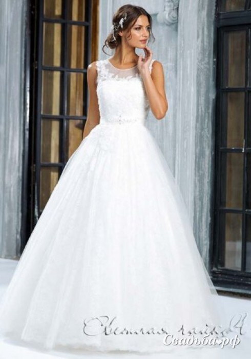 Это свадебное платье А-силуэта не оставит равнодушной даже самую притязательную модницу. Полупрозрачная вставка на груди с вырезом-лодочкой придаёт образу невинность и романтичность. Пышная юбка и корсет украшены кружевом и вышивкой. V-образный вырез на спине смотрится кокетливо. В таком платье из свежей коллекции 2014 года Вас точно заметят!