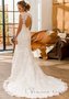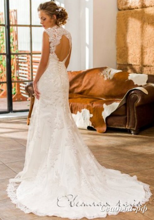 Полностью кружевная модель свадебного платья силуэта "русалка". Изюминка этой модели - красиво оформленная спинка: кордовое кружево поднимается от талии до плеч, соединяясь рядом пуговичек на шее. Такие же пуговички украшают шлейф, делая фигуру изящнее, визуально вытягивая ее. Лиф сердечком также закрыт кружевом и украшен стразовой вышивкой.