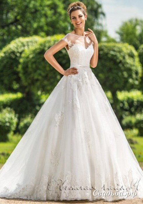 Изящное пышное свадебное платье с плечиками. Нежное кружево, которое так сдержанно и стильно украшает весь корсет, привлекает к себе взгляд. Отдельное внимание обращает на себя стильная отделка пояса, состоящая из декоративных элементов, которые украшены красивыми стразами. Лаконичная юбка из фатина и сдержанный, нежный корсет – именно то, что необходимо современной стильной невесте. Юбка платья и подол расшиты элементами кордового кружева.
