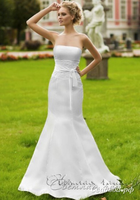 Это про этот лаконичный вариант свадебного платья силуэта "русалка". Платье из дорогого атласа, талия подчеркнута кордовым кружевом и поясом с бантом из атласной ленты. Небольшой шлейф подчеркнет красивую фигуру невесты, прибавит изысканности образу. Такой вариант свадебного платья выберет уверенная в себе и в своем образе невеста.