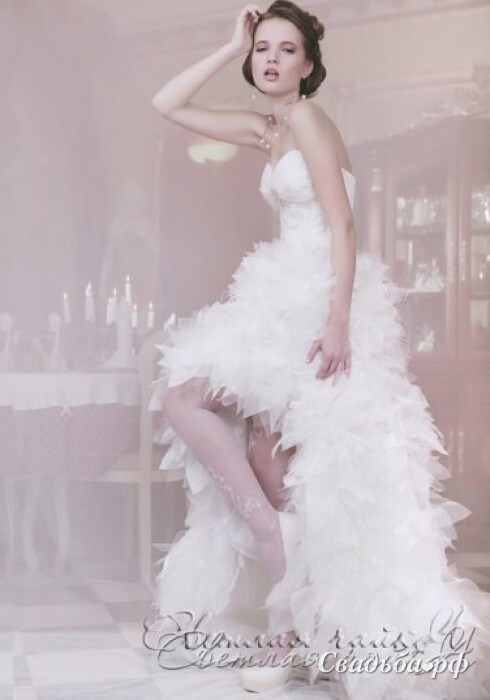 Эффектное свадебное платье поражает своими необычными формами и декольтированным корсетом. Оригинальная юбка-маллет с объёмными воланами необычной формы спереди приоткрывает прекрасные ножки невесты. Модель привлекает внимание к соблазнительной зоне декольте. В таком игривом наряде из свежей коллекции 2014 года Вас точно заметят!