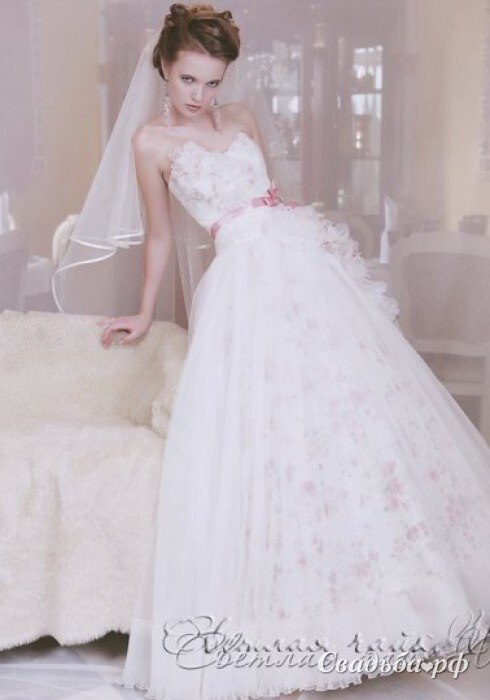 Органичное соединение элегантности и шика в данном свадебном платье пышного А-силуэта, создаст неповторимый образ невесте. Благодаря своей оригинальности и великолепию сочетания различных тканей по текстуре и цвету, оно прикует к себе лишь самые восторженные взгляды. Атласную юбку данной модели покрывает полупрозрачная органза с цветочным принтом нежно розового цвета. Верхний слой тонкого фатина с кромкой из гофрированной органзы, словно дымкой обволакивает цветочные композиции, что, безусловно, привносит в эту модель ноту романтизма. Корсет с вырезом в виде сердца за декорирован драпировкой и композицией из цветов, которые берут свое начало от середины юбки до самого декольте.
