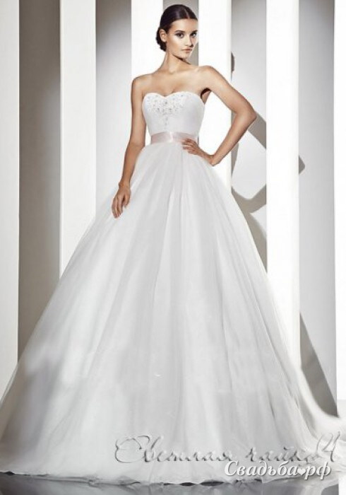 Роскошное платье А-силуэта из свежей коллекции именитого бренда Amour Bridal подчеркнёт Вашу талию и привлечёт внимание к бюсту. Контрастный поясок и тончайшая вышивка на груди придают наряду особый шик и королевский лоск. Пышная юбка из воздушного фатина дополнена шлейфом. В таком потрясающем платье Вы будете блистать!