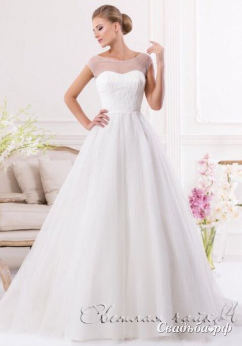 Элегантное свадебное платье со шлейфом. Зона декольте кокетливо прикрыта полупрозрачной сетчатой тканью, сквозь которую соблазнительно просвечивается нежная кожа. Строгий корсет с фигурным лифом эффектно подчёркивает изящество женской фигуры. Великолепная пышная юбка мягкими фалдами ниспадает к ногам прекрасной невесты.