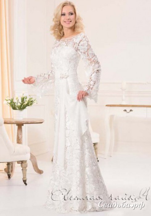 Элегантное длинное свадебное платье прямого покроя. Идеально подойдет для небольшого торжества. Для невесты, которая любит кружево и не представляет свой свадебный наряд без него.