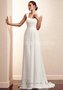 Свадебное платье в стиле минимализм. Шифоновая драпировка, присутствующая практически по всему корсету, выглядит очень аккуратной и нежной. Аккуратные широкие лямки, по желанию можно снять, ведь они являются дополнительным элементом в этом наряде. Линия талии выделена очень широким поясом. Элегантный шлейф гармонично продолжает неширокую юбку.