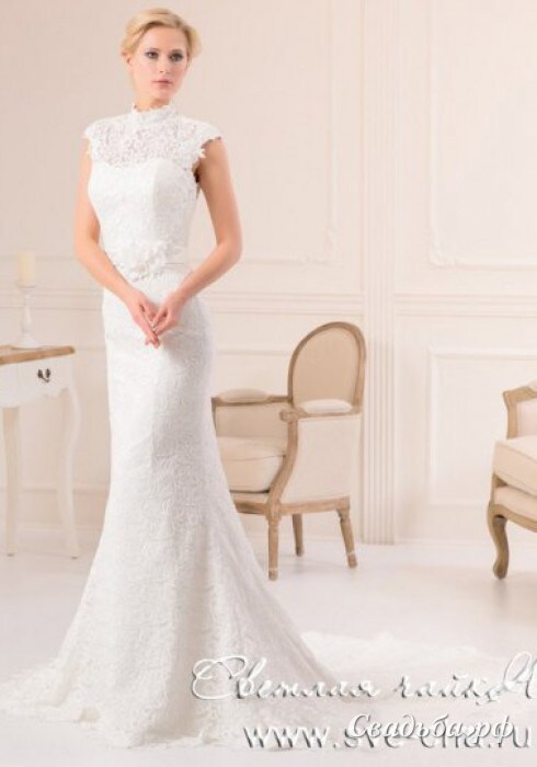 Элегантное кружевное платье из кордового кружева. Закрытый верх с воротничком-стоечкой выглядит очень элегантно и изысканно. Линия талии эффектно выделена широким поясом, украшенным объёмной цветочной композицией из ткани. Роскошная юбка силуэта русалочка струится вдоль фигуры и плавно переходит в великолепный романтичный шлейф.