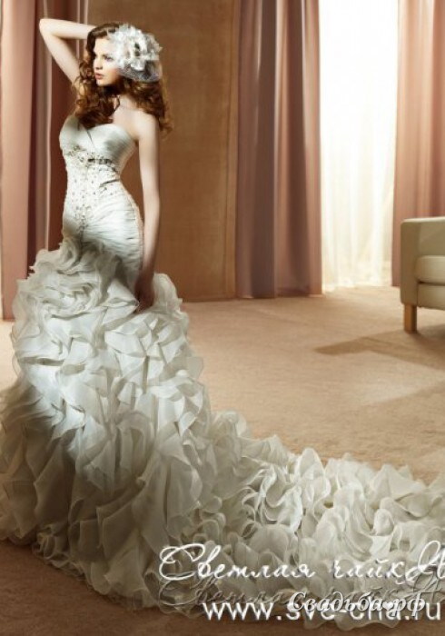 Прекрасное длинное свадебное платье со шлейфом силуэта "русалка". Корсет платья полностью задрапирован тонкой органзой, расшит платиновым бисером и стеклянными стразами. Юбка платья сделана оригинально - воланы пришиты не горизонтально, а вертикально относительно силуэта. Задумка очень оригинальная, великолепно смотрится, зрительно прибавляет рост.