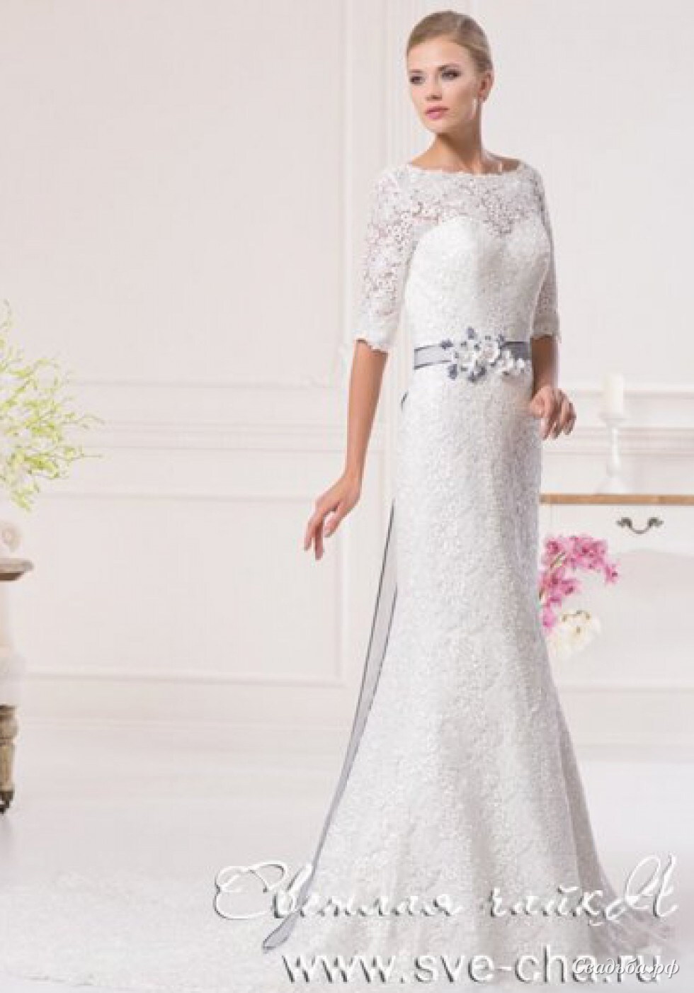 Красивая модель платья с рукавами из тонкого фатина, расшитого элементами кружева, которое, словно нежные лепестки белой розы, аккуратно переплелись на руках у невесты.