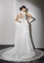 Элегантное свадебное платье выполнено из нежнейшего кружева. Наряд с удобной шнуровкой идеально садится по фигуре. На спинке находится вырез-капелька. Зона декольте открыта и обрамлена широкими бретелями. От середины бедра юбочка начинает расширяться и постепенно переходит в шлейф. Почувствуйте себя настоящей принцессой!