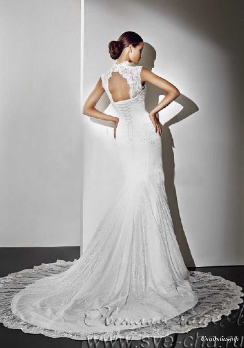 Элегантное свадебное платье выполнено из нежнейшего кружева. Наряд с удобной шнуровкой идеально садится по фигуре. На спинке находится вырез-капелька. Зона декольте открыта и обрамлена широкими бретелями. От середины бедра юбочка начинает расширяться и постепенно переходит в шлейф. Почувствуйте себя настоящей принцессой!