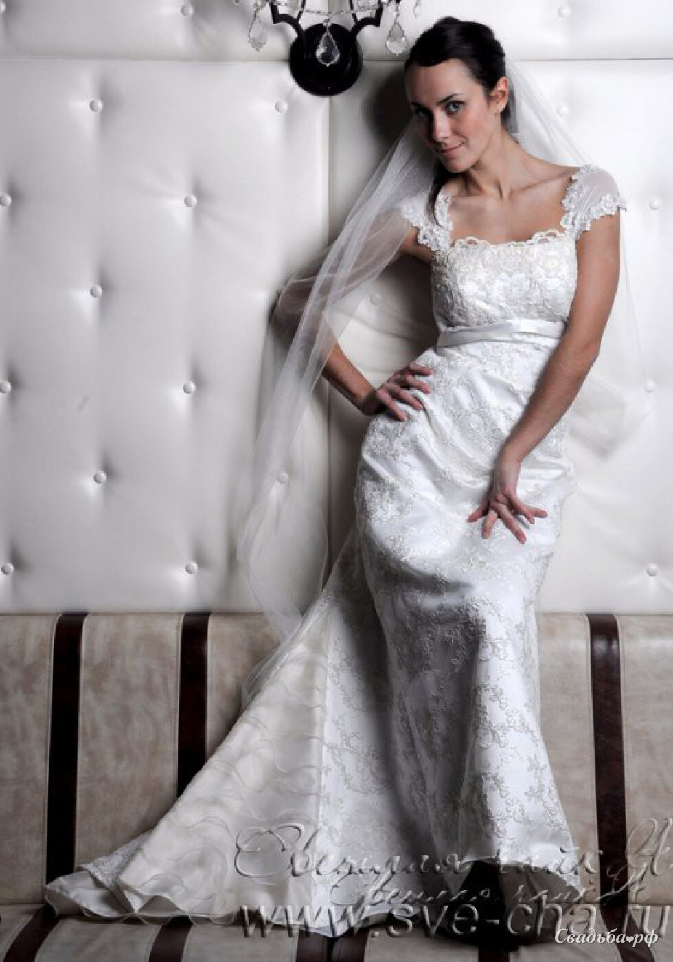 Нежное длинное свадебное платье с интересным шлейфом в виде вставки многоярусной органзы. Платье на бретелях, красиво очерчена линия груди атласным поясом на завышенной талии. Полностью вся модель расшита кружевом. Смотрится это очень нежно и лаконично.