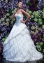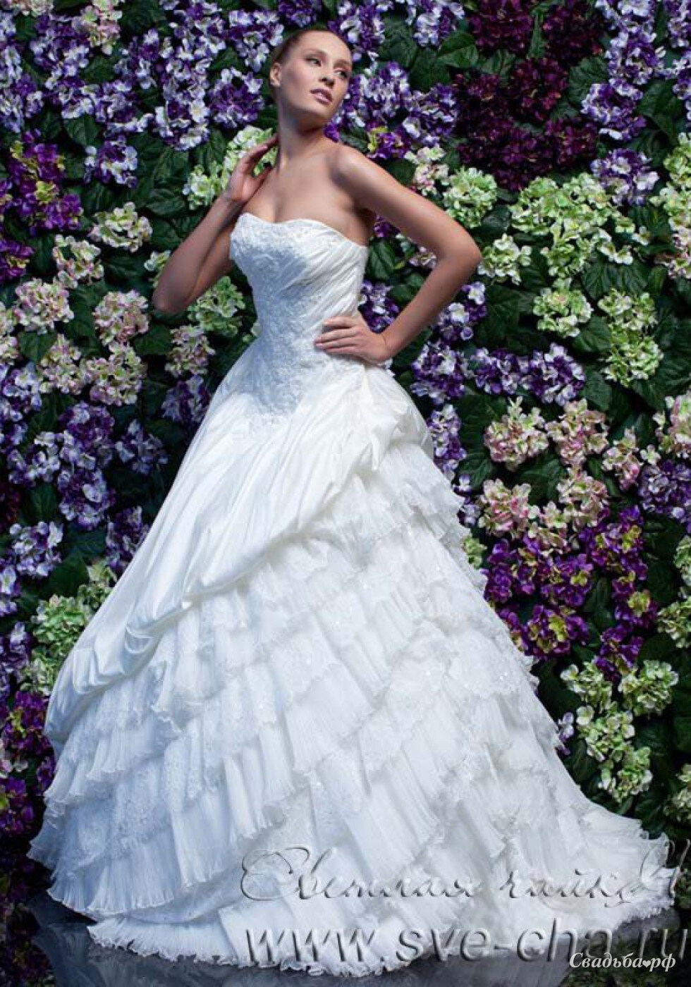 Великолепное длинное свадебное платье с пышной юбкой и красиво декорированным корсетом.