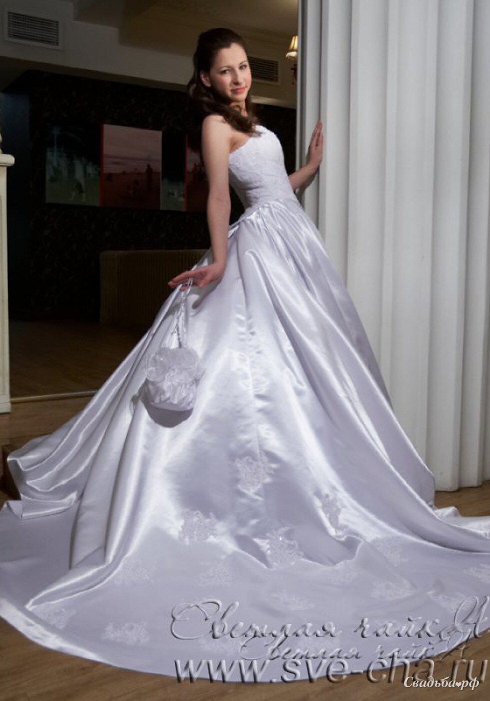 Великолепная модель длинного свадебного платья, которая полностью сшита из дорогого вида атласной ткани, и пышность которой регулируется дополнительным подъюбником. Заниженная талия у корсета визуально стройнит, юбка со шлейфом добавляет роста.