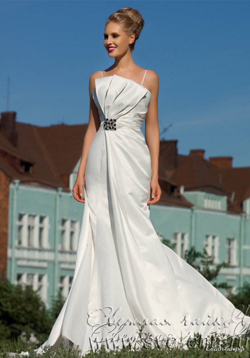 Экстравагантное свадебное платье в стиле "рыбка". Полностью атласная модель с асимметричной драпировкой и интересным необычным черно-белым элементом на классической талии.