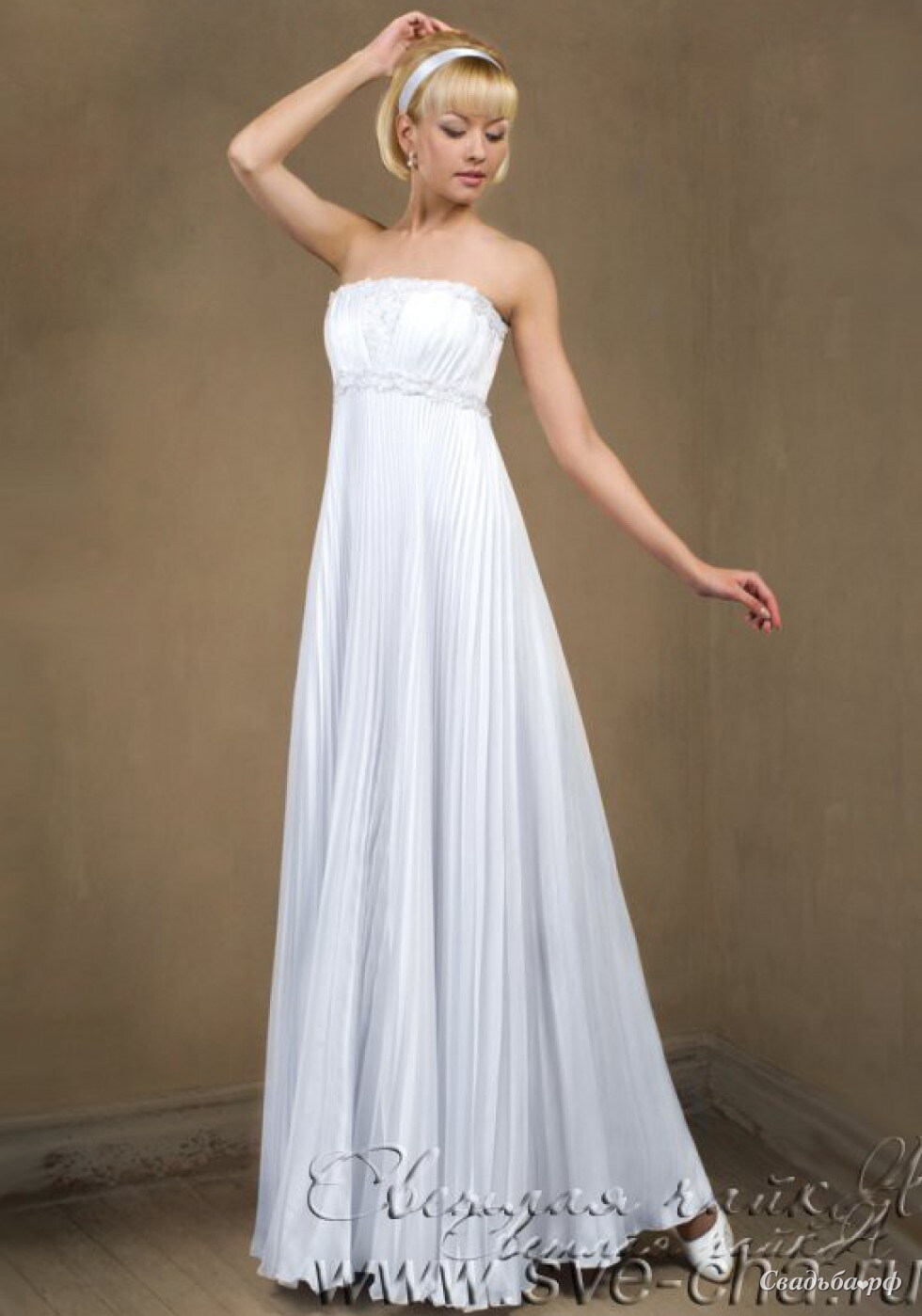 Сдержанная лаконичная модель длинного свадебного платья в стиле ампир. Изюминка платья в том, что оно сшито полностью из драпированного атласа. Смотрится это легко и красиво.