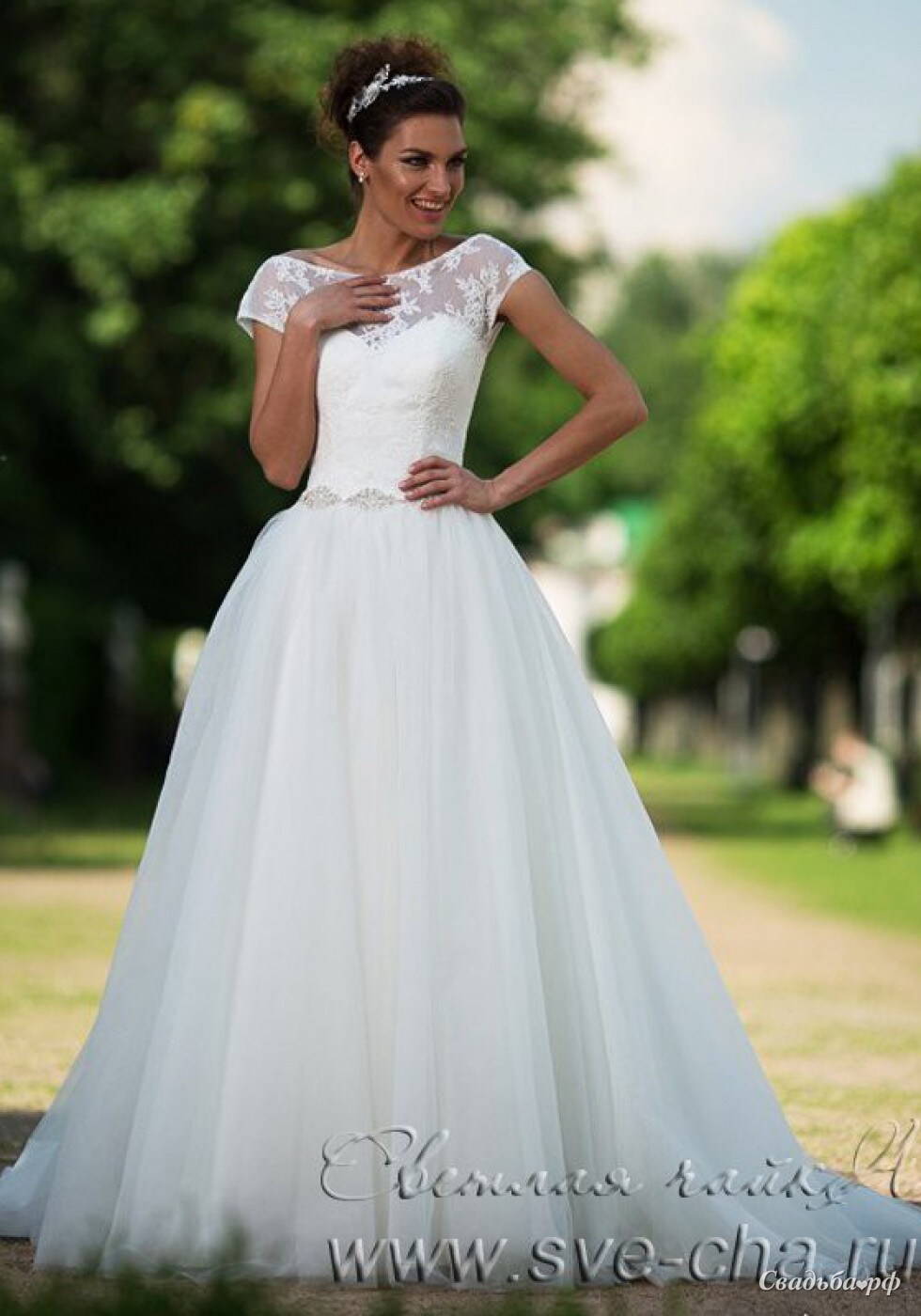 Изящное пышное свадебное платье с плечиками. Нежное кружево, которое так сдержанно и стильно украшает весь корсет, привлекает к себе взгляд. Отдельное внимание обращает на себя стильная отделка пояса, состоящая из декоративных элементов, которые украшены красивыми стразами.