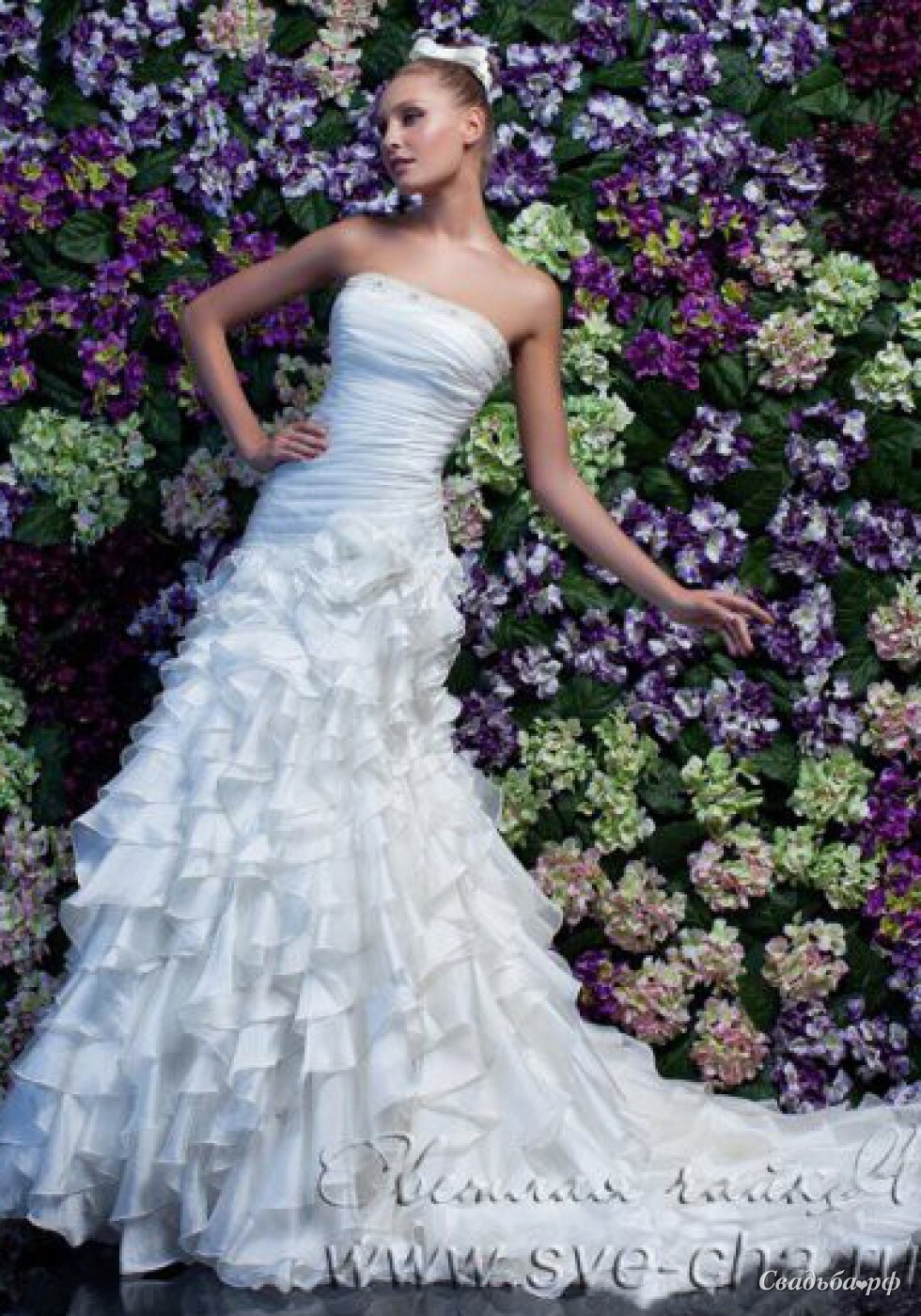 Нежное длинное свадебное платье в стиле "русалки". Корсет платья достаточно сдержан, полностью задрапирован легкой органзой, украшением корсета является линия декольте, декорированная полупрозрачным бисером, стеклянными каплями и небольшим количеством страз.