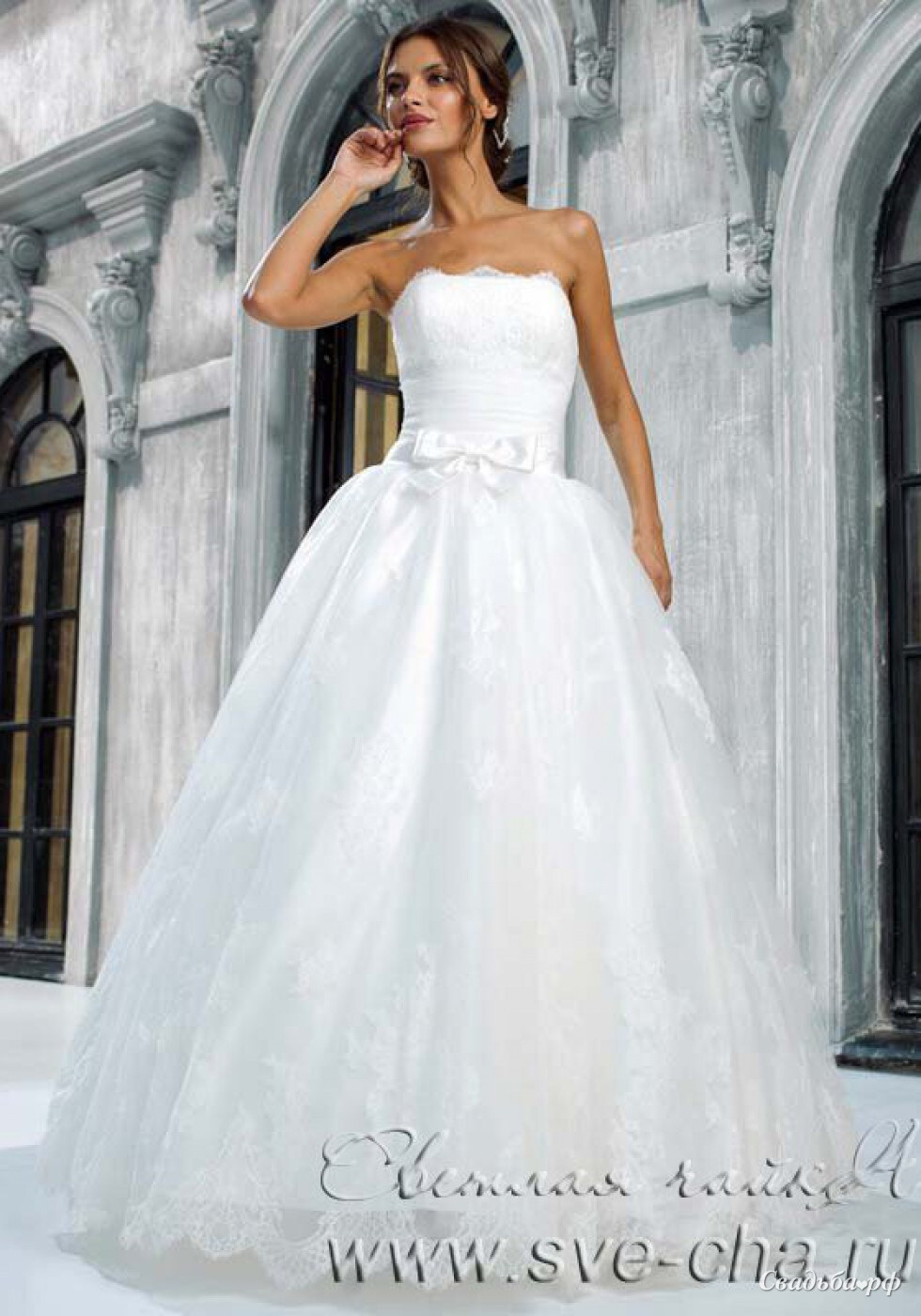 Прекрасное пышное свадебное платье с удивительными элементами нежного кружева, расшитого по всей длине юбки. Оригинально выполнен корсет, состоящий из кружевного лифа и легкой драпировки тонкого фатина на талии. Лаконичный пояс с бантом по центру из атласной ленты идеально завершает этот образ.