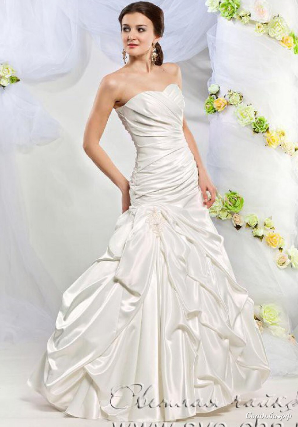 Воплощение элегантности и минимализма. Потрясающее свадебное платье с изумительной посадкой на талии, за счет хорошо скроенного корсета. Аккуратно уложенная драпировка хорошо подчеркнет все достоинства и незаметно скроет все недостатки. А красивый вырез, выполненный в форме сердца, придаст немного пикантности и загадки.