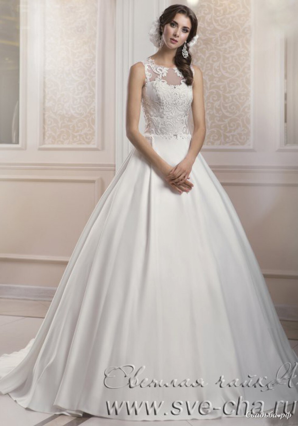 Элегантное длинное пышное свадебное платье из благородного атласа с закрытым корсетом и фактурным кружевом, низ которого переходит в прекрасный шлейф, добавляя роскошности и шика. Эта модель для стильной невесты, которая хочет подчеркнуть свою индивидуальность и чувствовать себя королевой на своем празднике!