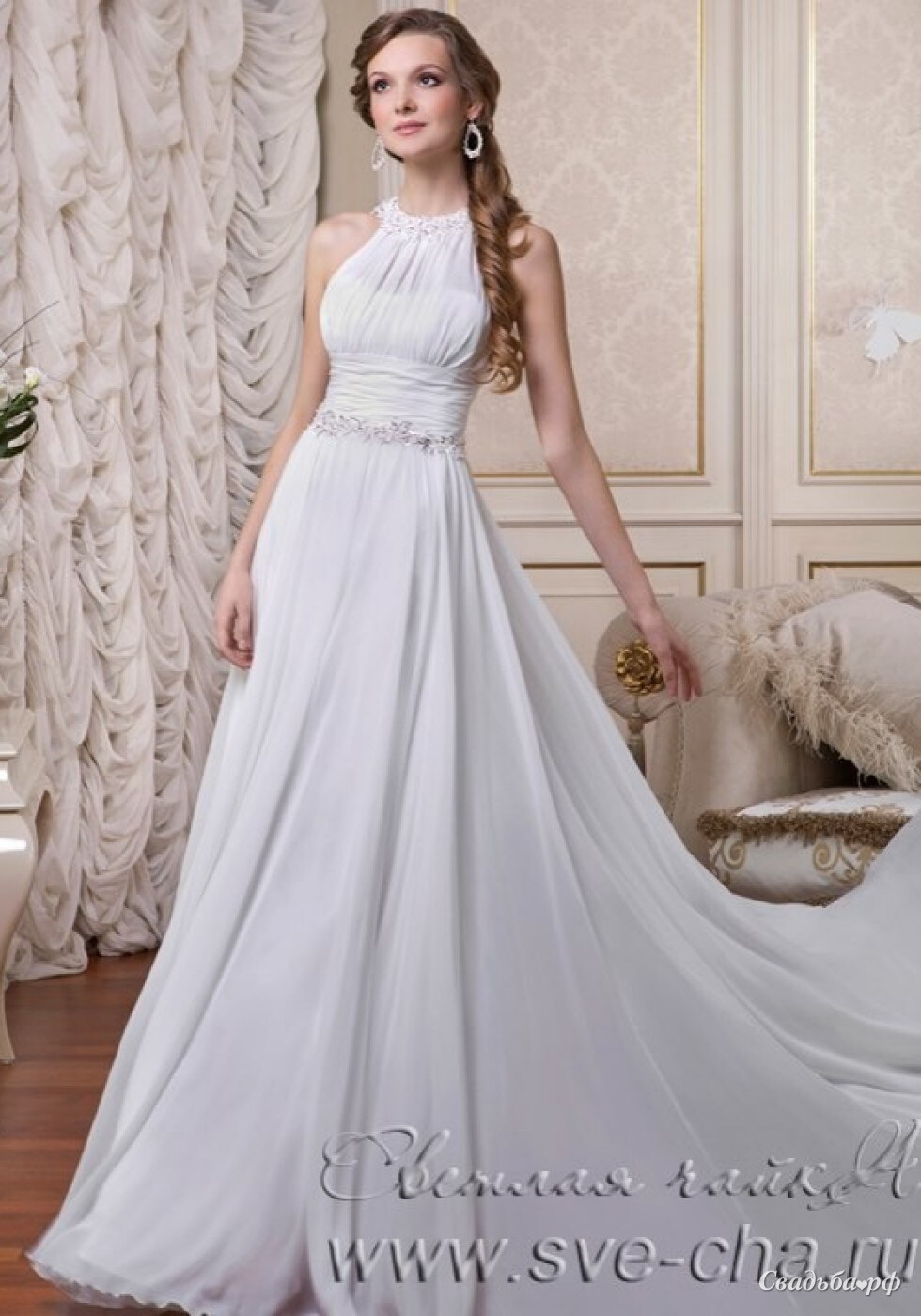 Длинное свадебное платье А-силуэта со шлейфом. Очень красивая и нежная модель свадебного наряда для невесты, которая предпочитает не только красоту и роскошь, но и удобство. Прикрытая линия декольте полупрозрачным шифоном, подчеркнутая линия талии драпированным поясом с милой отделкой из маленьких страз, и, конечно же, легкая, летящая, струящаяся шифоновая юбка со шлейфом не оставит равнодушным никого из гостей и саму невесту.