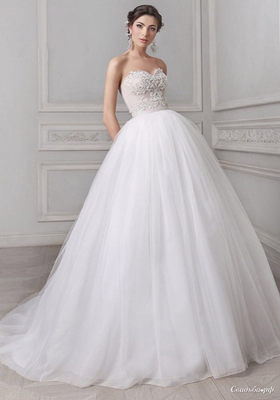 Данная модель поистине для девушки, которая хочет ощутить себя принцессой. Расшитый корсет с великолепным кружевом смотрится потрясающе, к тому же подчеркивает фигуру. Юбка у платья легкая и невероятно пышная для любительниц роскоши и легкости. Спину украшает невероятная шнуровка. В этом платье вы будете великолепны.