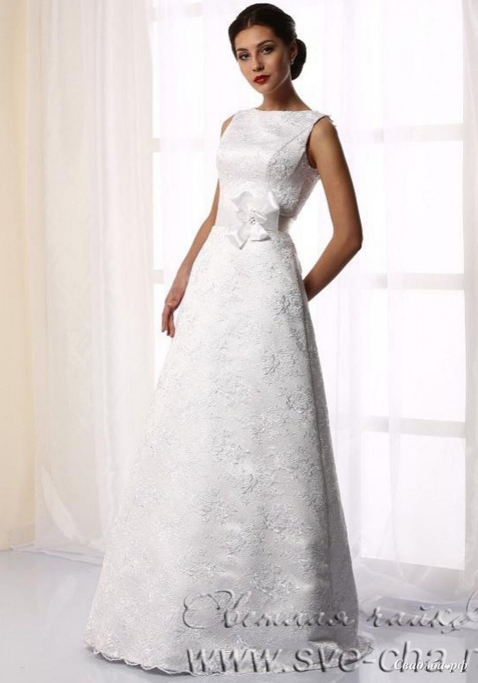 Достаточно скромное, выдержанное и без всяких излишеств - вот что можно сказать про это прекрасное платье А-силуэта. Такая модель будет к лицу абсолютно любому типажу невест. Аккуратный вырез лодочкой - как знак целомудрия. Нежнейшее кружево - благородство. Единственным съемным элементом является бант на поясе, который прекрасно подчеркивает талию, и по желанию может быть выполнен в совершенно любом цветовом решении.