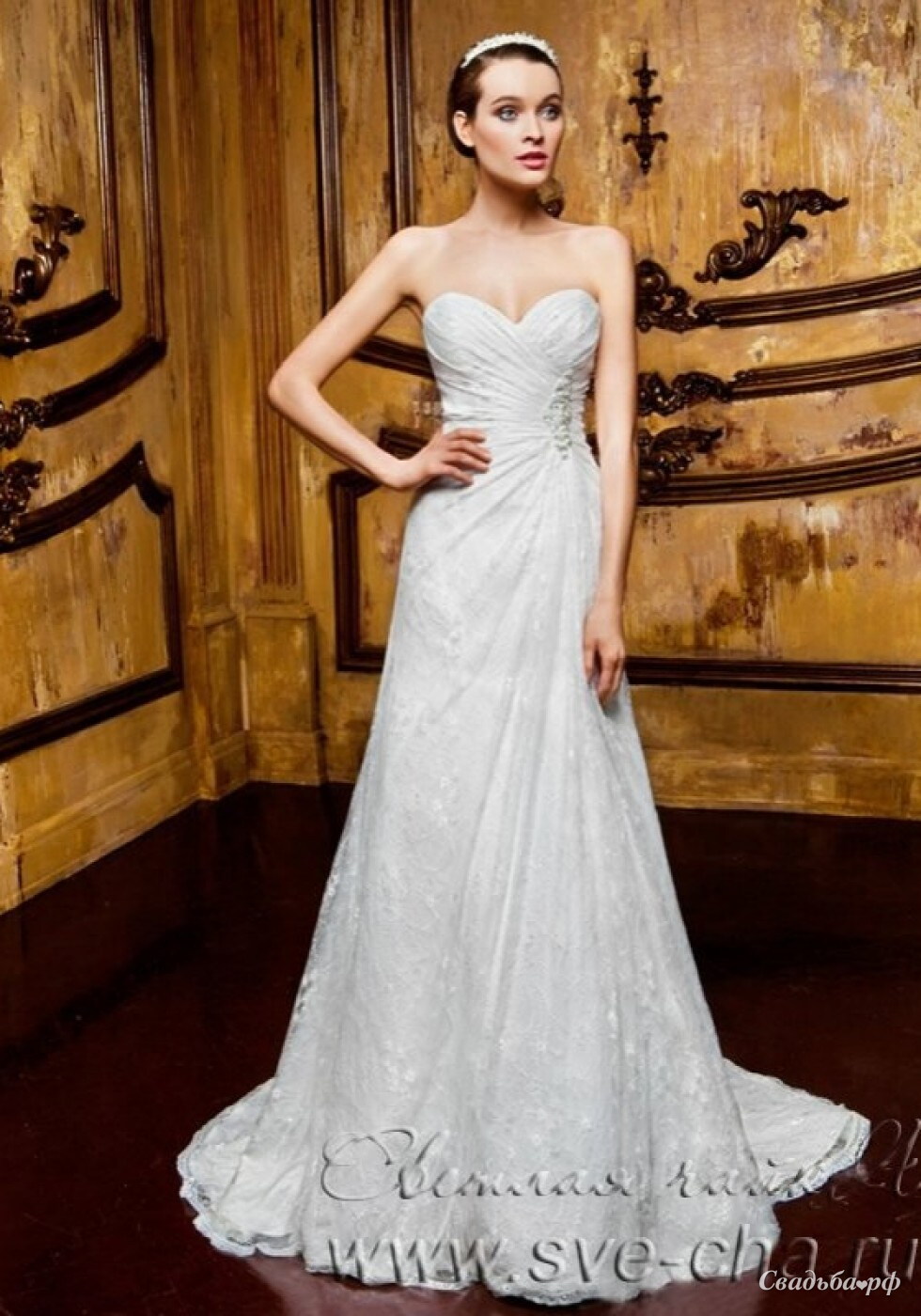 Элегантное длинное свадебное платье облегченного "А-силуэта". Нежное, обвораживающее кружево, которое является верхним слоем платья, очень красиво и деликатно смотрится в фасоне этой модели. Декольте корсета выполнено в форме сердца, что очень эффектно подчеркивает грудь. Декоративный элемент на талии, состоящий из еле заметных прозрачных капель, единственная деталь, которая может отвлечь внимание гостей от самого платья и Вашего великолепного образа в целом.
